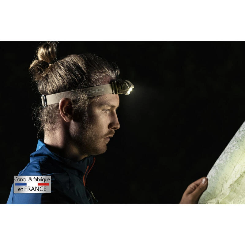 La frontale de l’armée française ! Une optique développée spécifiquement pour la marche rapide, lumière rouge pour préserver la vision nocturne. Bandeau camouflage OTAN. Chasse, Pêche, Astronomie.