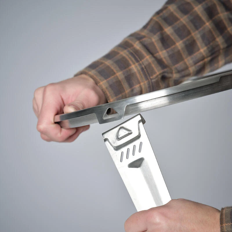 Cette plancha s’utilise principalement sur un feu de bois, pour cuisiner en pleine Nature. Elle peut être posée sur ses 3 pieds qui se montent sans outil en quelques secondes ou suspendue sous un trépied de cuisson avec les câbles acier inclus.