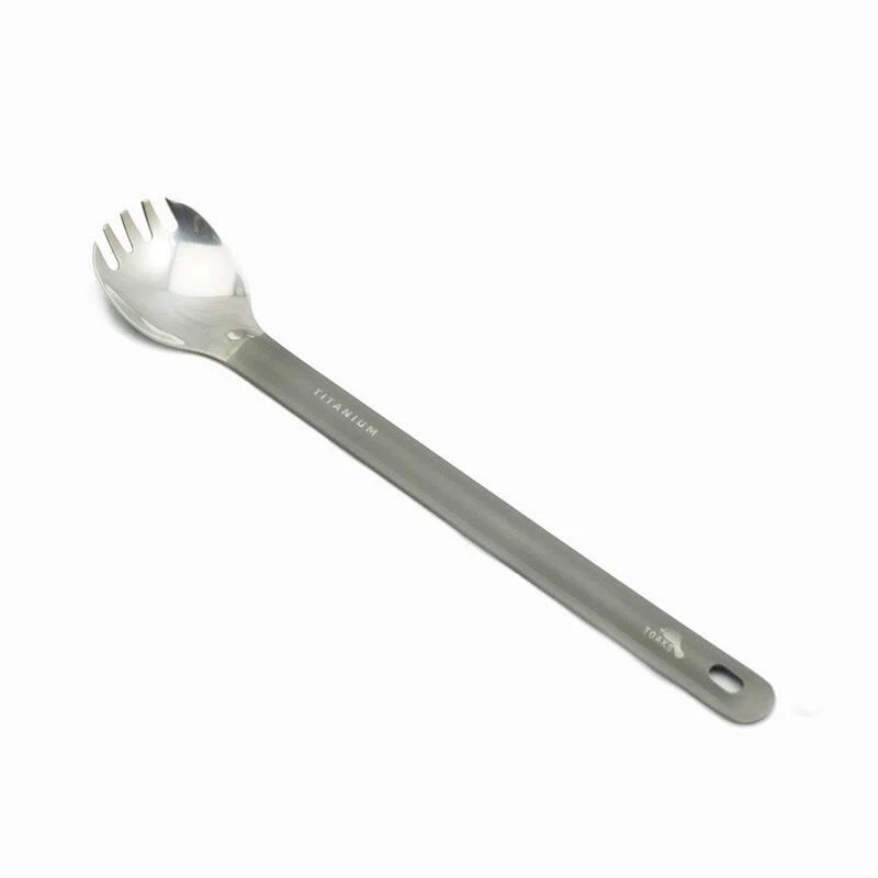 Cette cuillère-fourchette en titane léger de Toaks avec une longue poignée. Sa finition polie miroir offre un maximum de confort pour manger. Léger, robuste et facile à entretenir. Parfait pour toutes