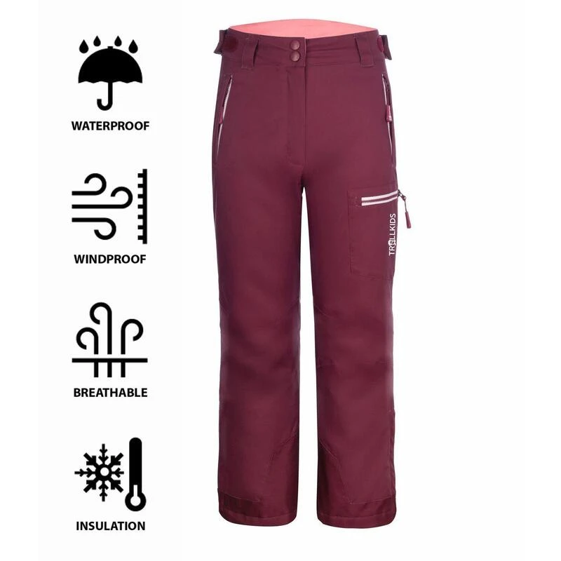 Pantalon pour la neige imperméable et respirant, destiné aux enfants, avec de nombreuses poches, des genoux préformés, des guêtres intégrées et le bas de jambes réglable en largeur.